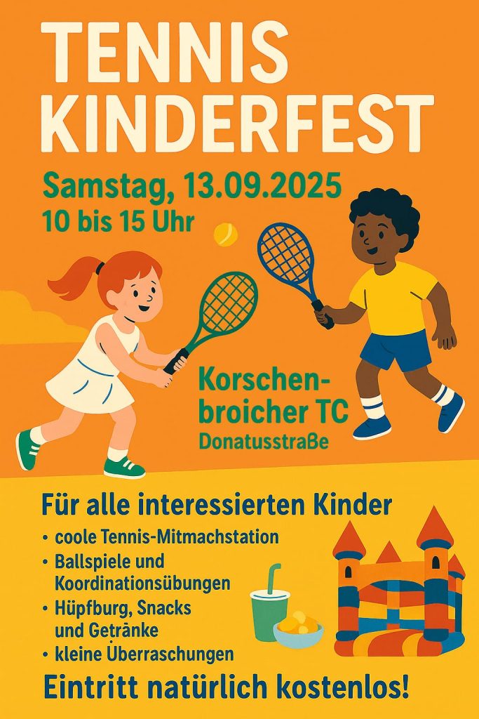 Am 13.09. startet unter Kindertennisfest. Alle Kinder und Jugendlichen unseres Vereins sind herzlich eingeladen. Wir freuen uns auf Euch. Die Details könnt Ihr unserem Plakat entnehmen. 10 bis 15 Uhr, Hüpfburg, Spielstationen, Getränke, Snacks und vieles mehr. Viel Spaß.